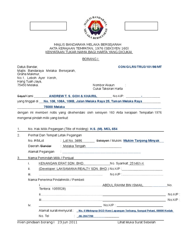 Akta Kerajaan Tempatan 1976 Seksyen 160 Kerajaan Tempatan 1976 Seksyen 160 Kenyataan Tukar Nama Bagi Harta Yang Dicukai Borang I Pk Jpph 05 R1