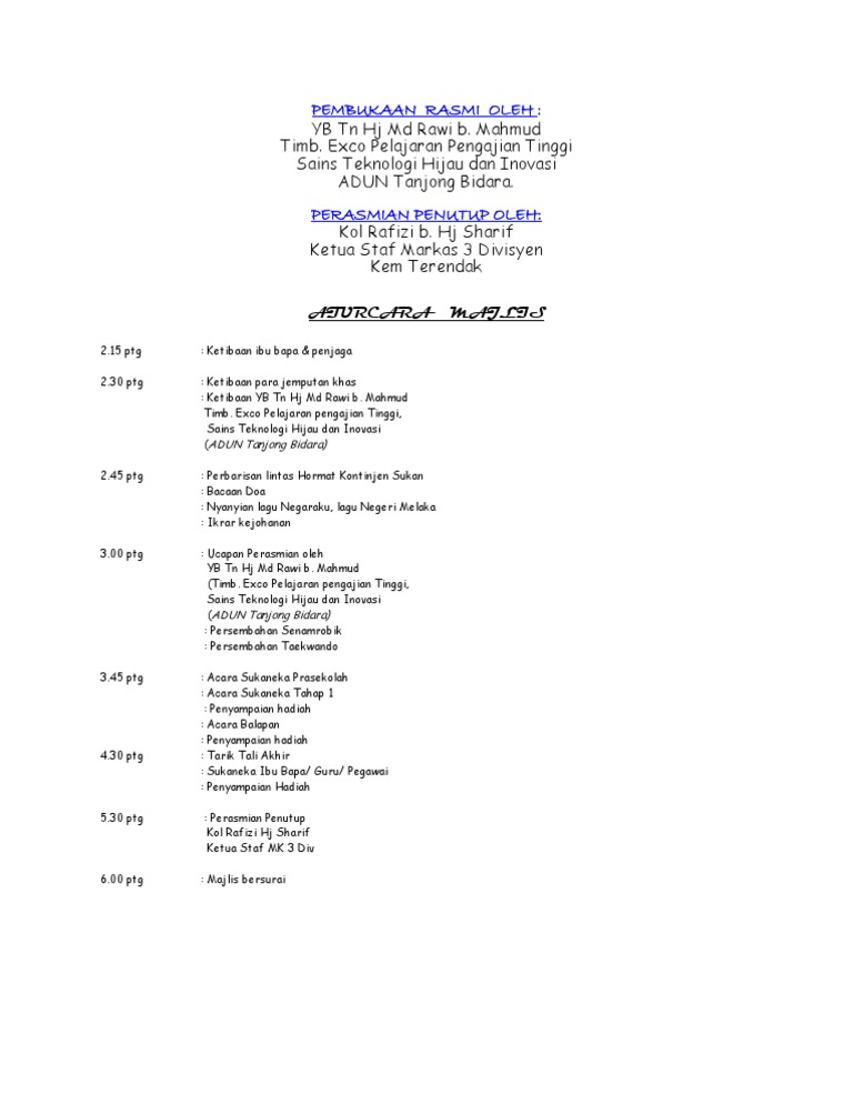 Contoh aturcara majlis perasmian. Contoh aturcara majlis anugerah perkhidmatan cemerlang. Ucapan perasmian yang amat berhormat perdana menteri timb. Cikgu raihan jalaludin telah kongsikan koleksi teks ucapan bagi pelbagai acara rasmi di sekolah. Untuk pengetahuan semua teks teks ucapan ini bukanlah miliknya kesemuanya.