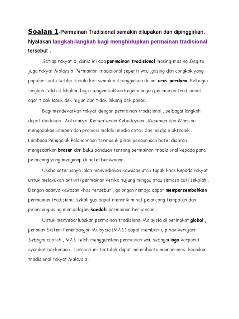 Antaranya pihak kerajaan harus mewajibkan setiap sekolah di malaysia mengambil bahagian dalam pertandingan permainan tradisional sama ada di peringkat sekolah daerah negeri dan kebangsaan. Tambahan pula permainan tradisional juga merupakan satu daya tarikan yang signifikan dalam industri pelancongan. Permainan tradisional di malaysia contoh rangka jawapan pendahuluan. Di samping itu pihak media massa harus selalu menonjolkan berita tentang permainan permainan tradisional ini.