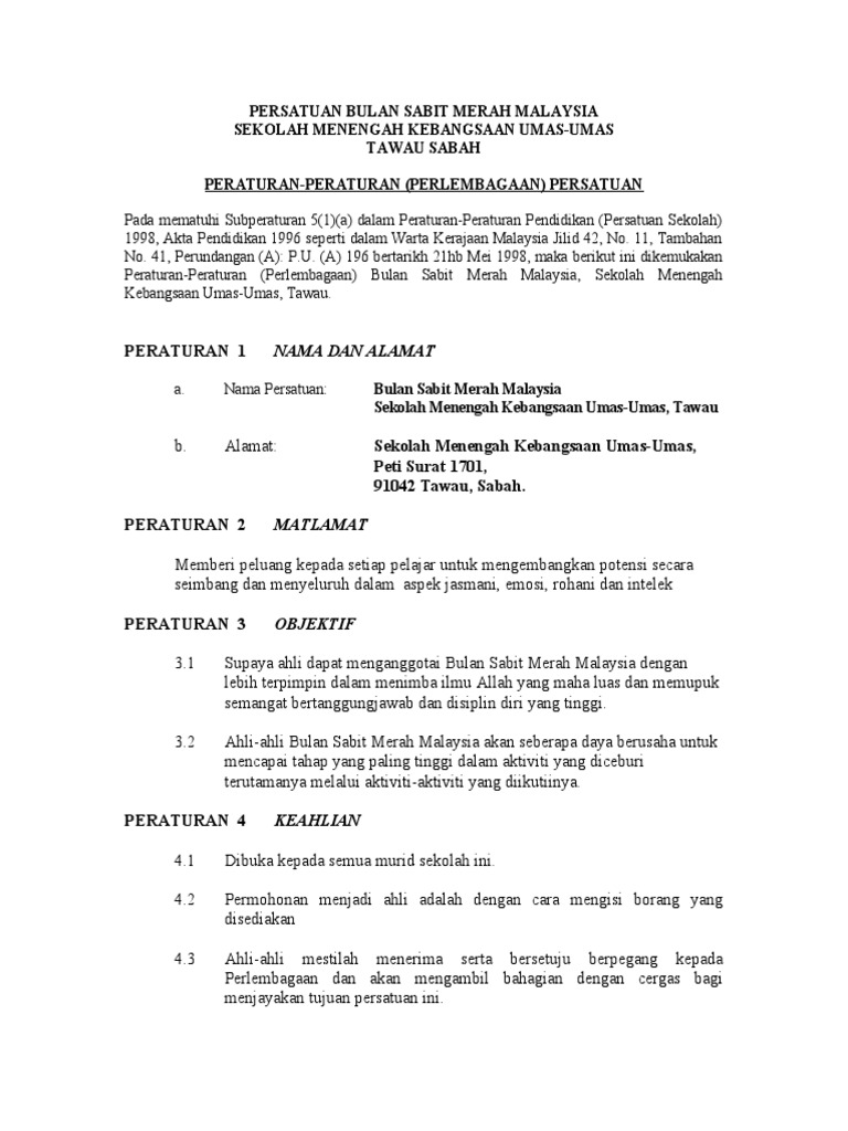 Perlembagaan persatuan bulan sabit merah malaysia. Persatuan ini diiktiraf kerajaan malaysia pada tahun 1957 dan persatuan palang merah antarabangsa pada tahun 1963. Bulan sabit merah malaysia juga merupakan salah satu unit beruniform yang popular di sekolah. Jika perlembagaan tidak secara nyata menjelaskan maksud sesuatu perkara barisan ajk. Perlembagaan bermaksud perlembagaan persatuan bulan sabit merah malaysia unit belia smk sacred heart.