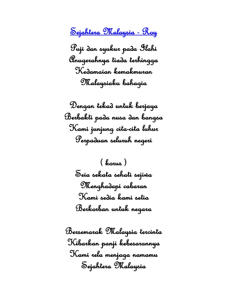 Puji dan syukur pada ilahi anugerahnya tiada terhingga kedamaian kemakmuran malaysiaku bahagia dengan tekad untuk berjaya berbakti pada nusa dan bangsa kami junjung cita cita luhur perpaduan seluruh negeri korus seia sekata sehati sejiwa menghadapi cabaran kami sedia kami setia berkorban untuk negara bersemarak malaysia tercinta kibarkan panji kebesarannya kami rela menjaga namamu sejahtera.