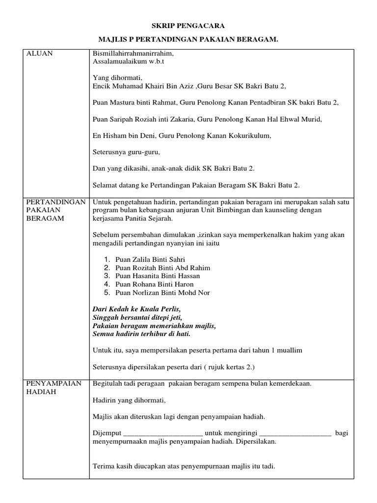 Teks Pengacara Majlis Pertandingan Pakaian Beragam